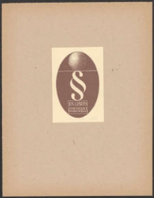 Linoryt barwny, 7,1x4,6 cm. Kompozycja zamknięta, na ekslibrisie w polu owalu u góry kula, niżej znak graficzny paragrafu, w dolnej części kompozycji w ramce napis " Ex libris Aleksandra Wareckiego", kolorystyka brązowo-biała.