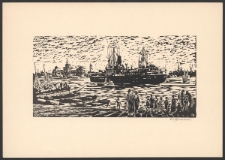 Linoryt, 15x30 cm. Widok na płynący w porcie Port-Said okręt polski ORP Gryf, przed nim płynie holownik, po prawej na brzegu jedna grupa ludzi, po lewej na łodziach druga grupa ludzi, w głębi po lewej budynek Urzędu Kanału Sueskiego.