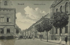 Druk cz.-b., 9x14 cm. Pocztówka z obiegiem pocztowym 17.07.1912r. Widok częściowy ulicy Warszawskiej (Greifenberger-Straβe) w Nowogardzie (Naugard).