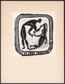 Cynkotypia kreskowa, 9x8 cm. Kompozycja zamknięta, na ekslibrisie pochylający się nagi mężczyzna dający kwiatek nagiej kobiecie, po obwodzie kompozycji elementy meandra (rodzaj ornamentu) i u dołu napis "Ex libris Franciszka Wójcika", kolorystyka czarno-biała. Kolekcja Ludwika Piosickiego.