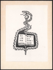 Cynkotypia, 11,2x6,7 cm. Kompozycja wielokątna, na ekslibrisie laska Eskulapa z wężem, który oplatuje kij i tworzy u dołu wielokąt, w którym jest rozłożona książka, na jej stronach napisy: na lewej "Ex libris", na prawej " Wandy Gondzik", kolorystyka czarno-biała. Kolekcja Ludwika Piosickiego.