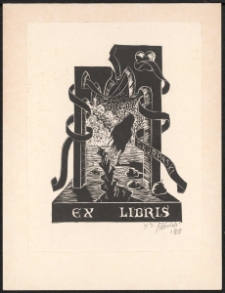 Linoryt, 10,8x7,8 cm. Kompozycja otwarta, na ekslibrisie na postumencie brama opleciona wstęgami, przed nią figura, dalej postać fantastyczna , cztery głazy porozrzucane w obrębie kompozycji, na bramie po prawej napis "T. Kurpaski", u dołu kompozycji napis " Ex libris", kolorystyka czarno-biała. Kolekcja Ludwika Piosickiego.