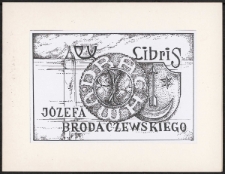 Cynkotypia, 8,5x12,7 cm. Kompozycja zamknięta, na ekslibrisie na pierwszym planie dwie tarcze: rycerska (obronna) i herbowa, z lewej kopia rycerska, nad tarczami napis "Ex libris", po tarczami napis "Józefa Brodaczewskiego", kolorystyka czarno-biała. Kolekcja Ludwika Piosickiego.