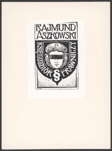 Cynkotypia, 7,7x5,2 cm .Kompozycja prostokątna, na ekslibrisie portret kobiety z przepaską na oczach w polu tarczy herbowej, po lewej napis "Księgozbiór", po prawej "Prawniczy", pod portretem znak graficzny paragrafu prawniczego, u góry napis "Rajmund Aszkowski", kolorystyka czarno-biała. Kolekcja Ludwika Piosickiego.