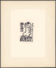 Linoryt, 6x4 cm. Kompozycja otwarta, na ekslibrisie według fantazji artysty popiersie kobiety z nagimi piersiami, niżej otwarta leżąca książka, u góry po lewej napis "Ex libris", po prawej napis "Józefa", u dołu kompozycji napis "Kulagi", kolorystyka czarno-biała.